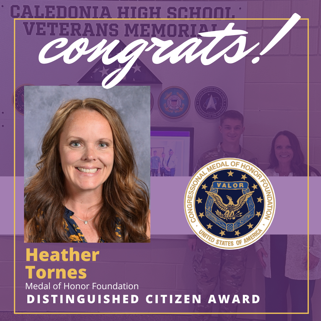 Each year the Congressional Medal of Honor Society selects one individual nationwide as the recipient of their Distinguished Citizen Award and this year our very own Heather Tornes from Caledonia High School has been chosen for this prestigious honor! Heather’s dedication to education and youth development has made a profound impact on our students, and now her efforts are being recognized on a national stage! She received this prestigious award at the Circle of Honor Dinner held at the New York Stock Exchange on March 5, 2025. Heather attended the NYSE Closing Bell Ceremony as a guest, alongside over 20 Medal of Honor recipients being recognized for their service and sacrifice. We are beyond proud of Heather for her commitment to instilling leadership, integrity, and civic responsibility in our students.