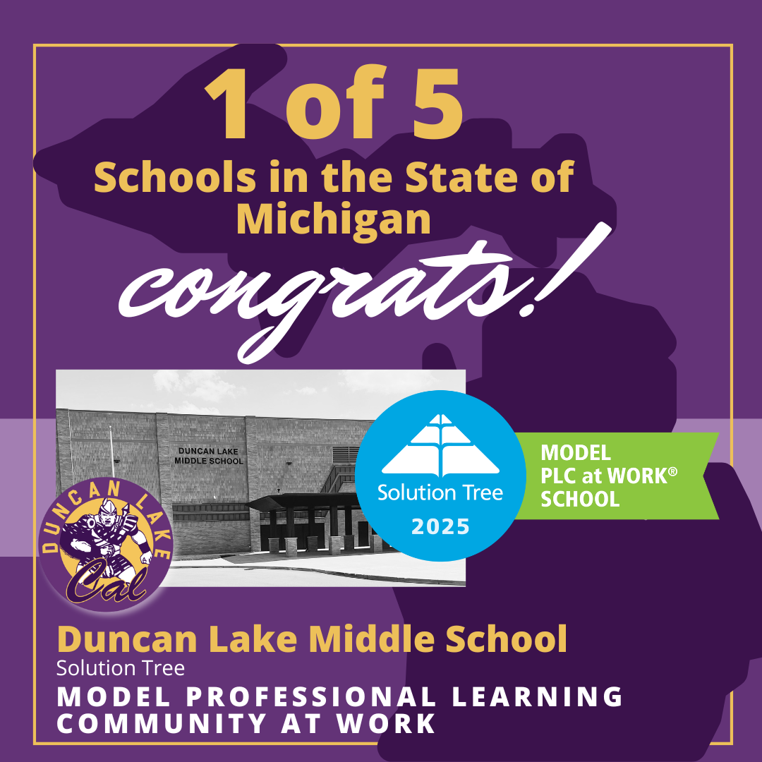 Duncan Lake Middle School has been nationally recognized as a Model Professional Learning Community at Work® by Solution Tree—and is one of only 5 schools in the entire state of Michigan to earn this honor! This recognition celebrates the incredible work of our educators who focus on learning, collaboration, and results to help every student succeed. We’re proud of the commitment and culture that make Caledonia such a special place to learn and grow.