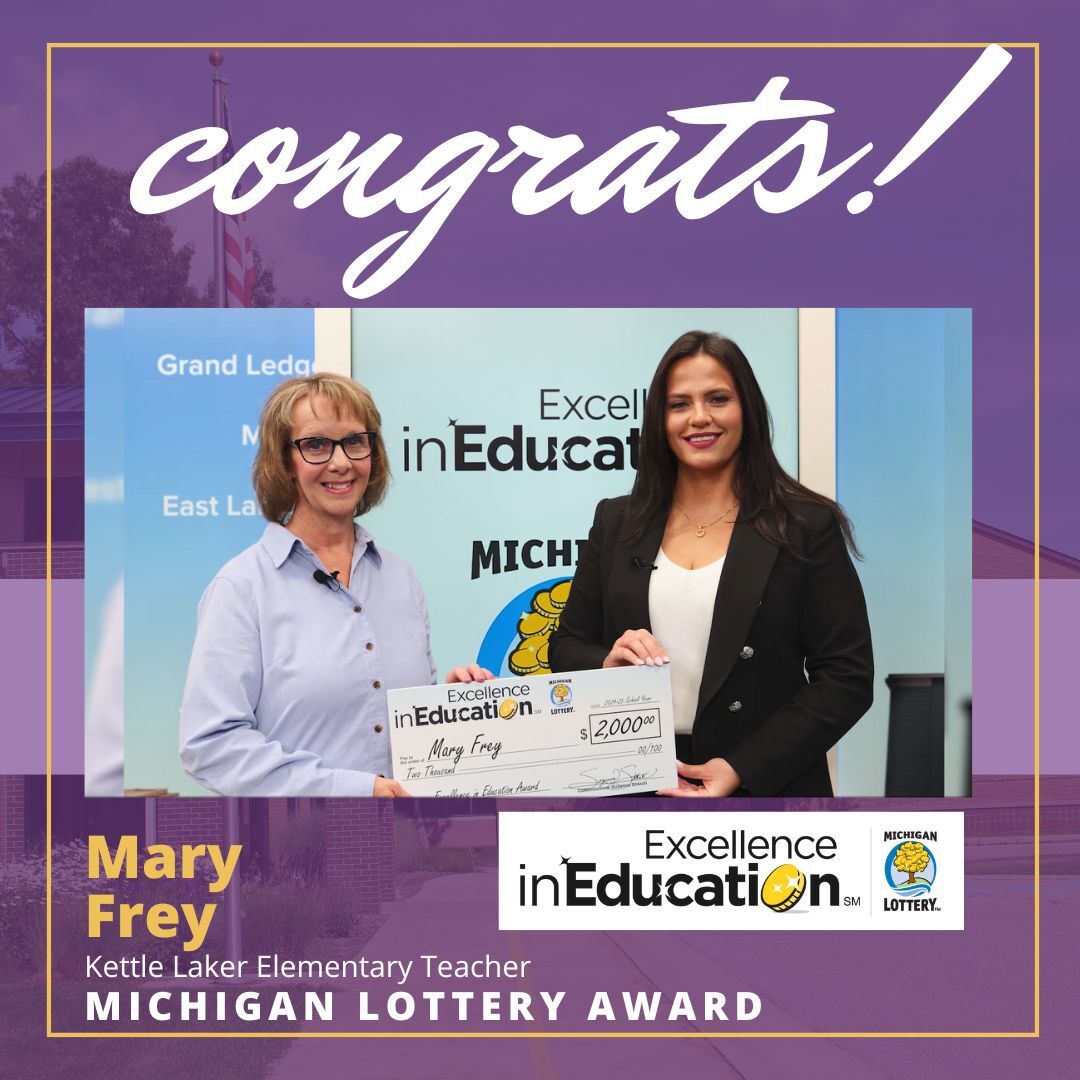 Congratulations to Mary Frey, kindergarten teacher at Kettle Lake Elementary School, for being honored with the Michigan Lottery’s Excellence in Education Award! Mrs. Frey’s incredible dedication to her students and her passion for building a strong foundation for lifelong learning have made a lasting impact on our school community. We are so proud to have Mrs. Frey represent Caledonia Community Schools!