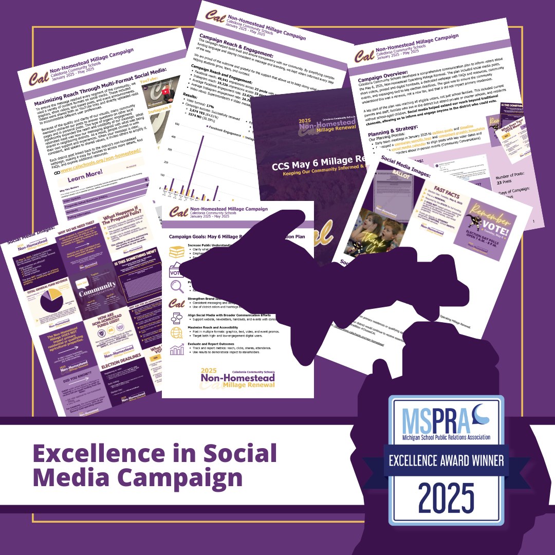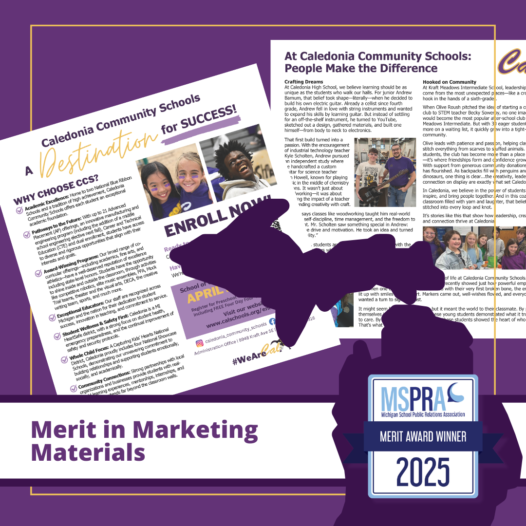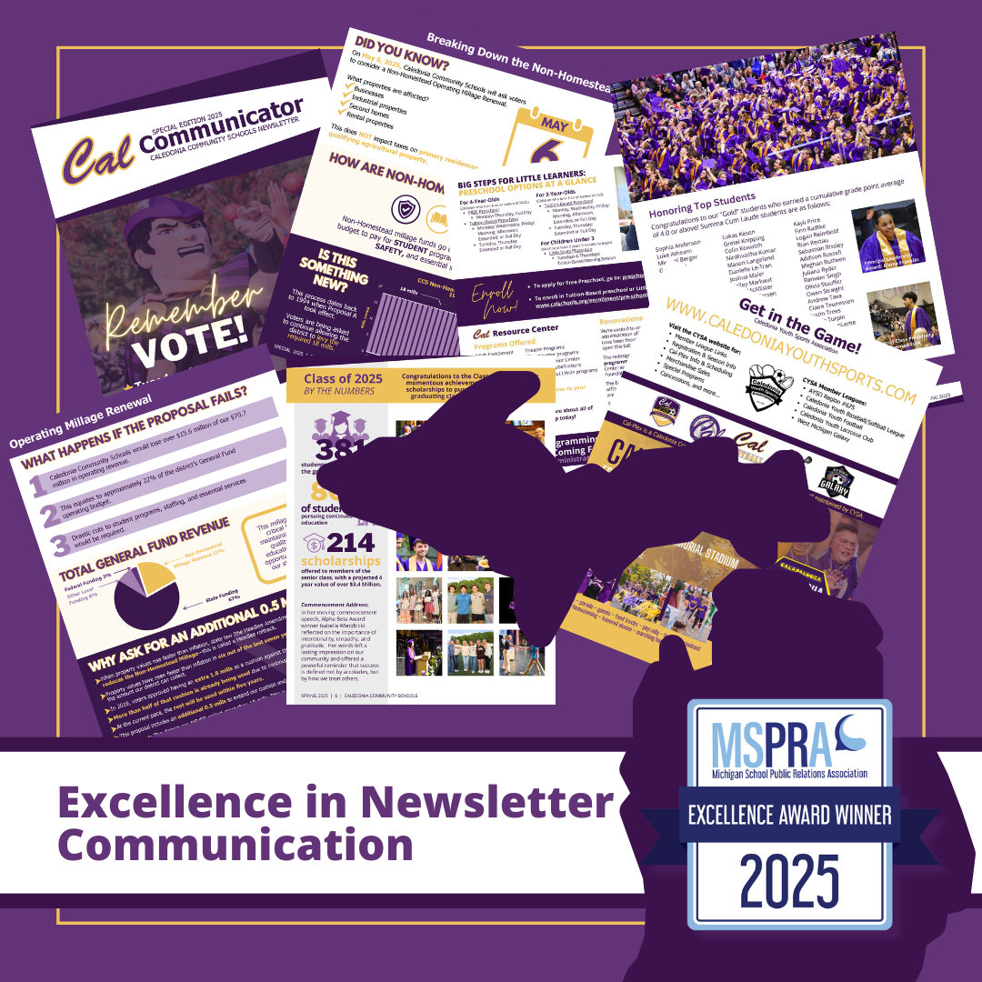 Caledonia Community Schools was honored with four statewide awards from the Michigan School Public Relations Association (MSPRA) for outstanding achievement in school communications. The district earned three Excellence Awards for its social media campaign, community newsletter, and photography, along with a Merit Award for marketing materials. These recognitions highlight Caledonia’s ongoing commitment to transparent, creative, and engaging storytelling that celebrates our students, staff, and community, where people truly make the difference.