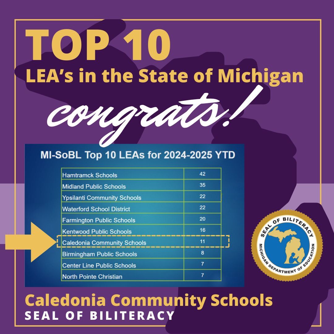 Caledonia Community Schools has been named one of the Top 10 Local Education Agencies (LEAs) in Michigan for the number of students earning the Seal of Biliteracy in 2024-2025! This honor celebrates our students’ incredible achievement in becoming proficient in English AND another world language.
