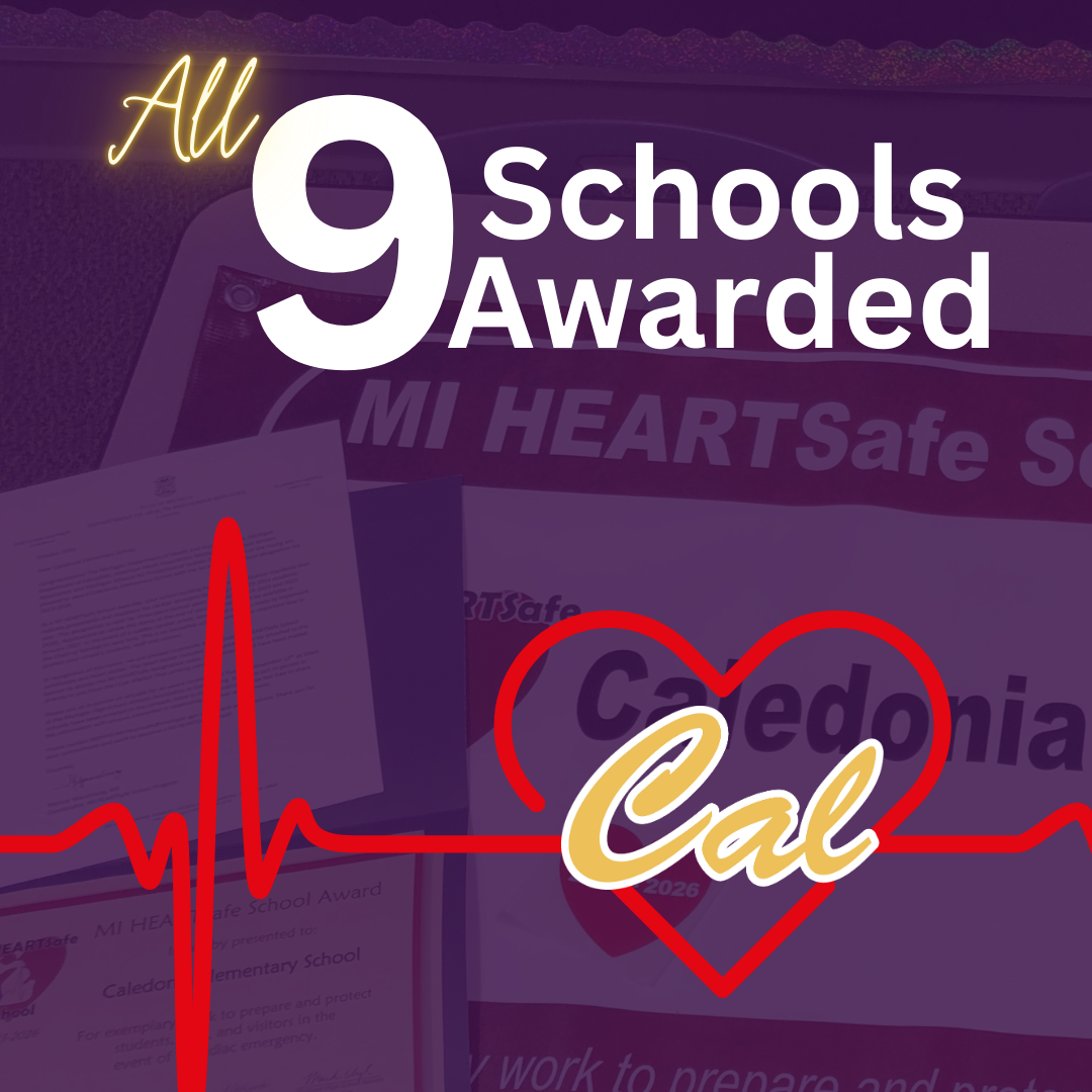 We are thrilled to share that all 9 of our schools in the district have earned the prestigious MI HEARTSafe School designation for 2023-2026! This honor, presented by the Michigan Department of Health and Human Services, Michigan Department of Education, American Heart Association, Michigan High School Athletic Association, and Michigan Alliance for Prevention of Sudden Cardiac Death of the Young, recognizes our commitment to creating a safer learning environment and helping prevent sudden cardiac death.