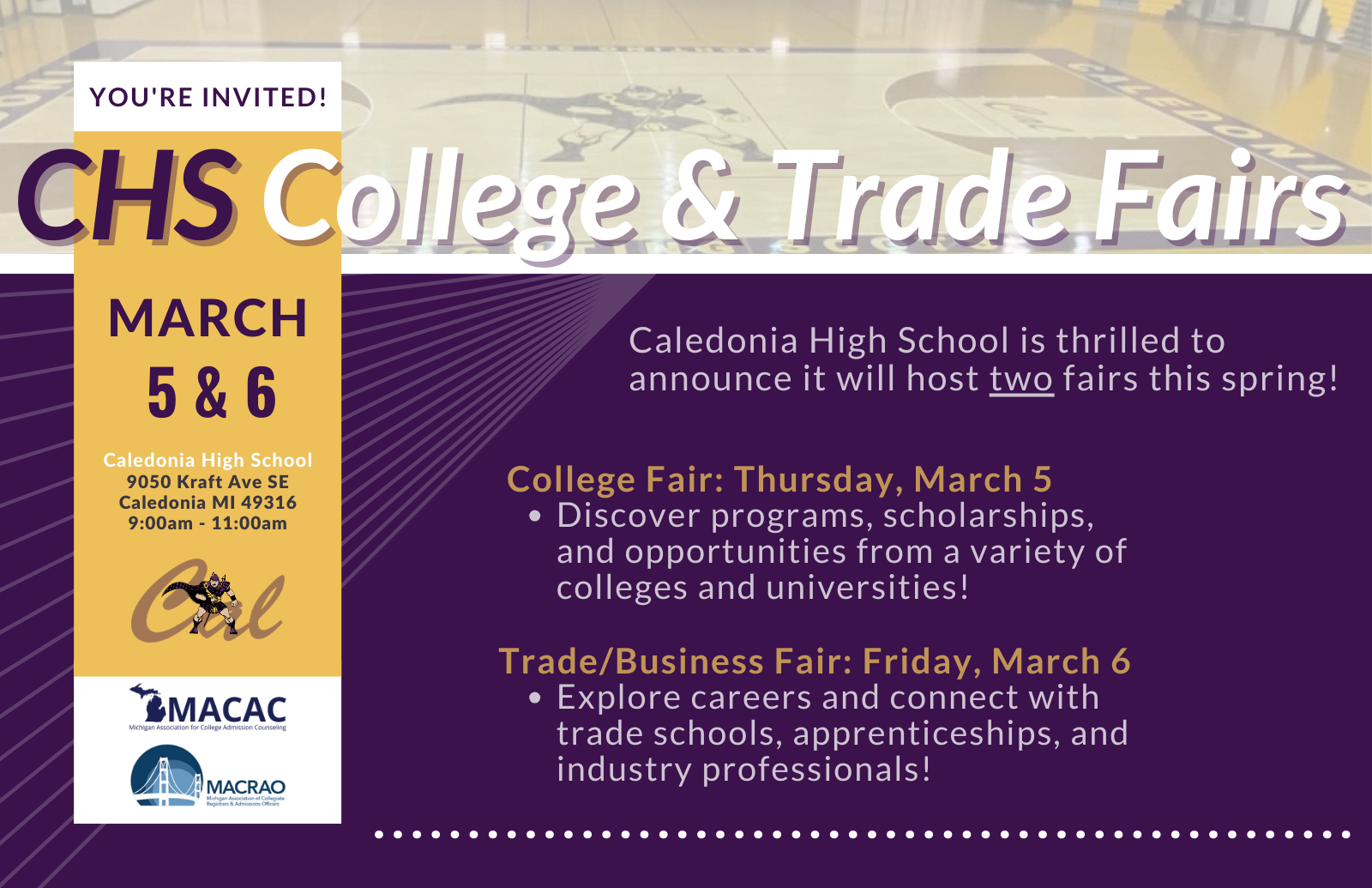 Caledonia High School is excited to host a MACAC & MACRAO College & Trade Fair! Discover programs, scholarships, and opportunities from a variety of colleges and universities!